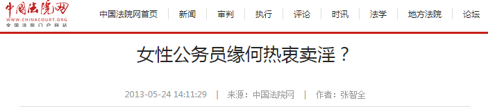 当然,女性公务员卖淫并不是第一次被媒体关注。据中国法院网2013年的一篇评论文章《女性公务员缘何热衷卖淫?》(法律读品注:这个标题真的很有问题,什么叫热衷?)称,《中新网》5月17日报道:江苏常州警方日前查处了12家存在卖淫嫖娼活动的违法SPA养生会所,发现卖淫女大都呈现低龄化、高学历的特点。在抓获的卖淫女中,年纪最大的28岁,不乏知名企业的“白领”、“金领”,甚至教师、公务员。